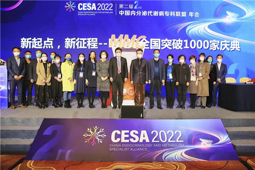 大會舉行了隆重的MMC突破1000家盛典,中國工程院范先群院士、中國工程院寧光院士、朱大龍教授、趙家軍教授、嚴勵院長、谷衛教授,國家標準化代謝性疾病管理中心省級分中心代表:劉萍教授、秦映芬教授、單忠艷教授、鄭超教授、吳勝利教授、陳蕾教授、王育璠教授、杜建玲教授、勵麗教授上臺,優秀分中心代表:鄭啟東教授、戴元成教授、董其娟教授、徐鳳梅教授、姜冉華教授、顧雪疆教授、唐榮教授、齊敬霄教授,上海智眾醫療科技有限公司 CEO李振杰先生,阿斯利康商業創新執行總監王健先生一同上臺參與1000家醫院的落地慶典。